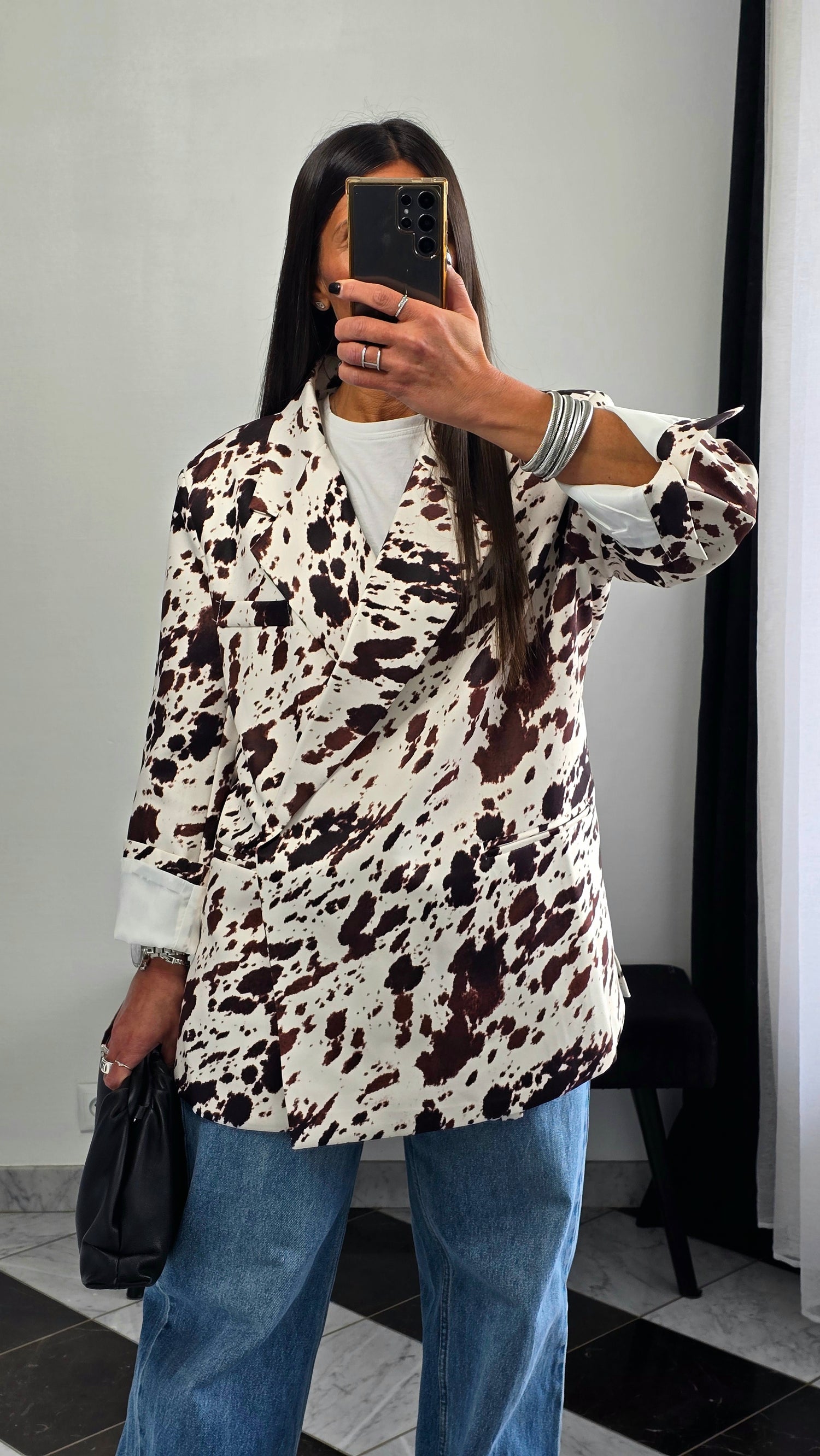 Blazer imprimé vache écru et chocolat – coupe droite structurée & fermeture croisée