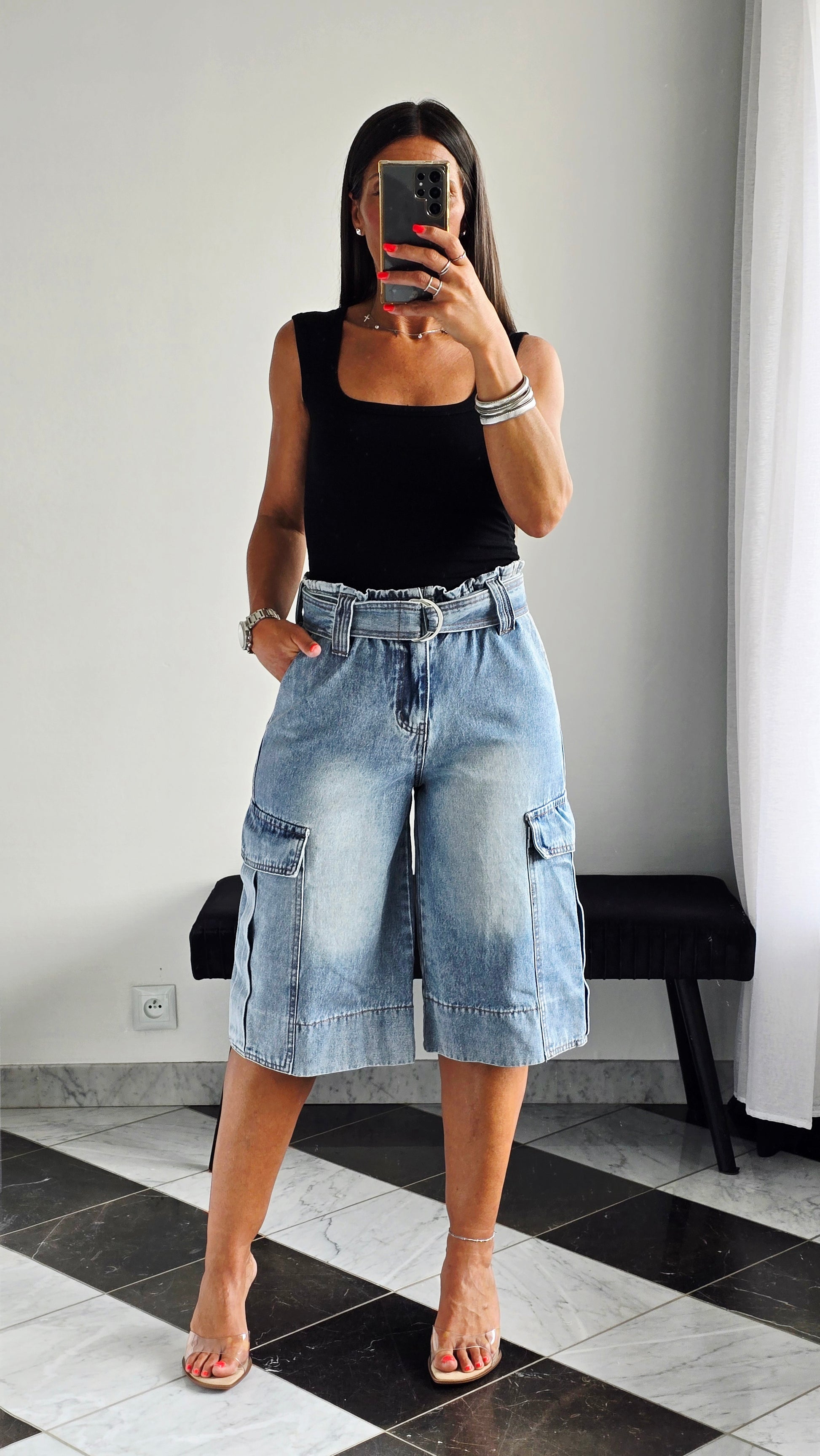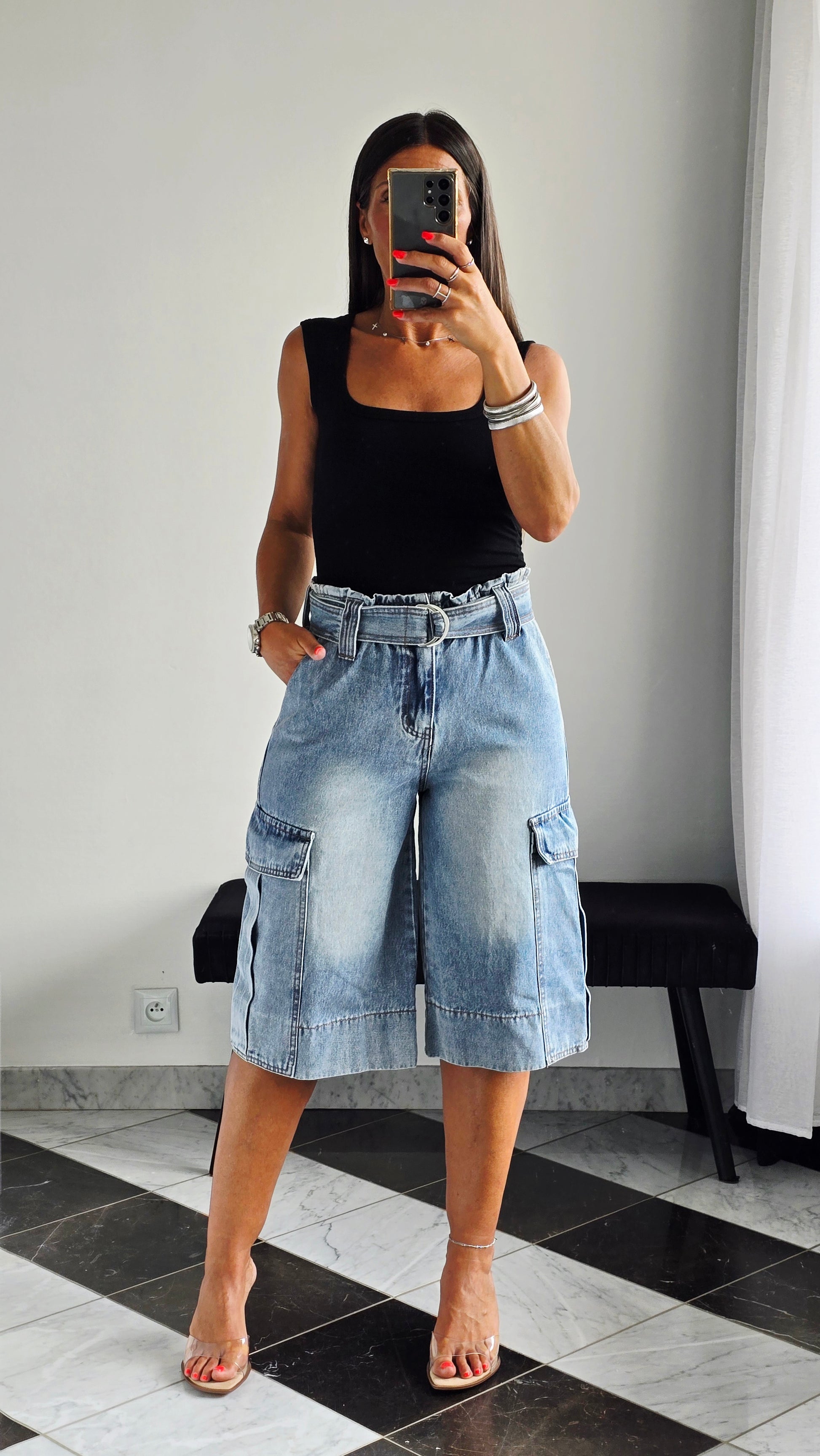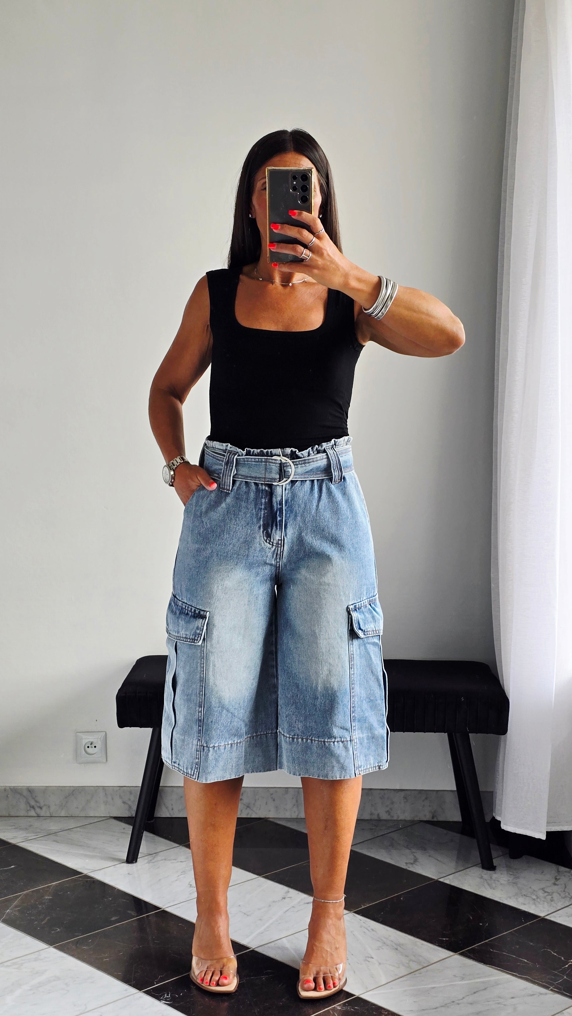 Pièce forte et ultra stylée, ce bermuda en jean revisite la coupe cargo avec une taille paperbag et une ceinture intégrée qui structure parfaitement la silhouette. On aime ses grandes poches à rabat sur les côtés et son look casual-chic, idéal à porter avec un débardeur ou une chemise pour un look urbain assumé.