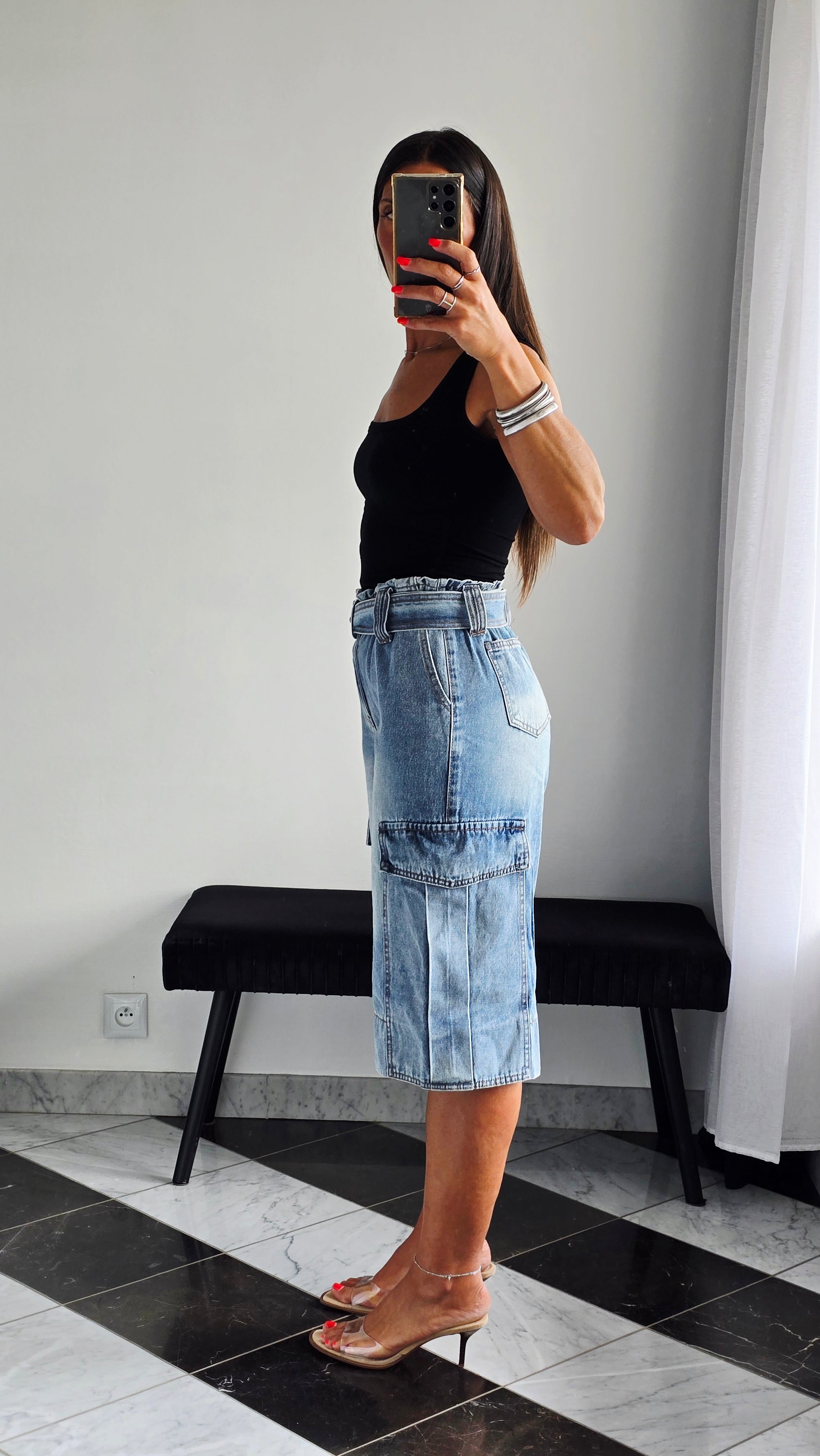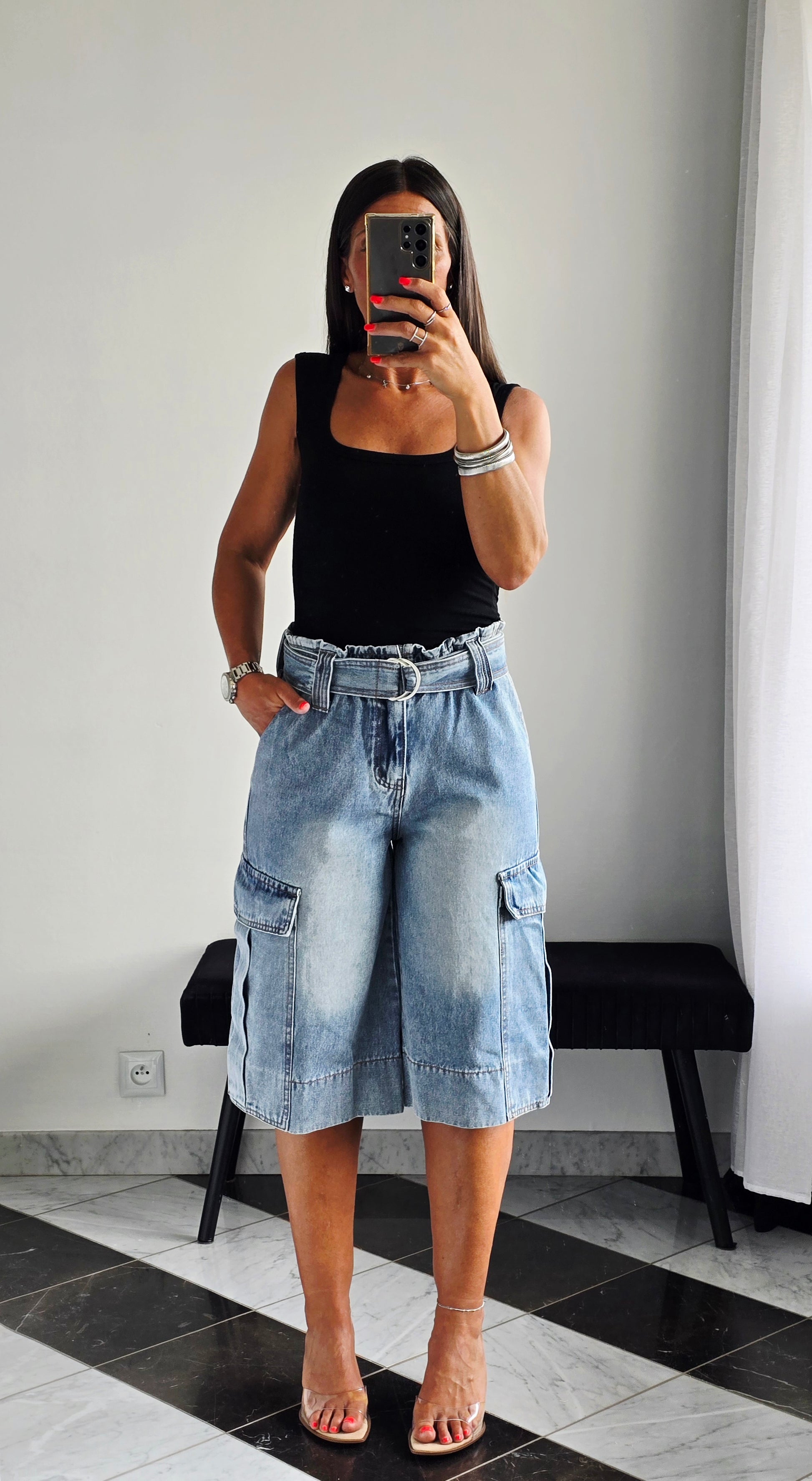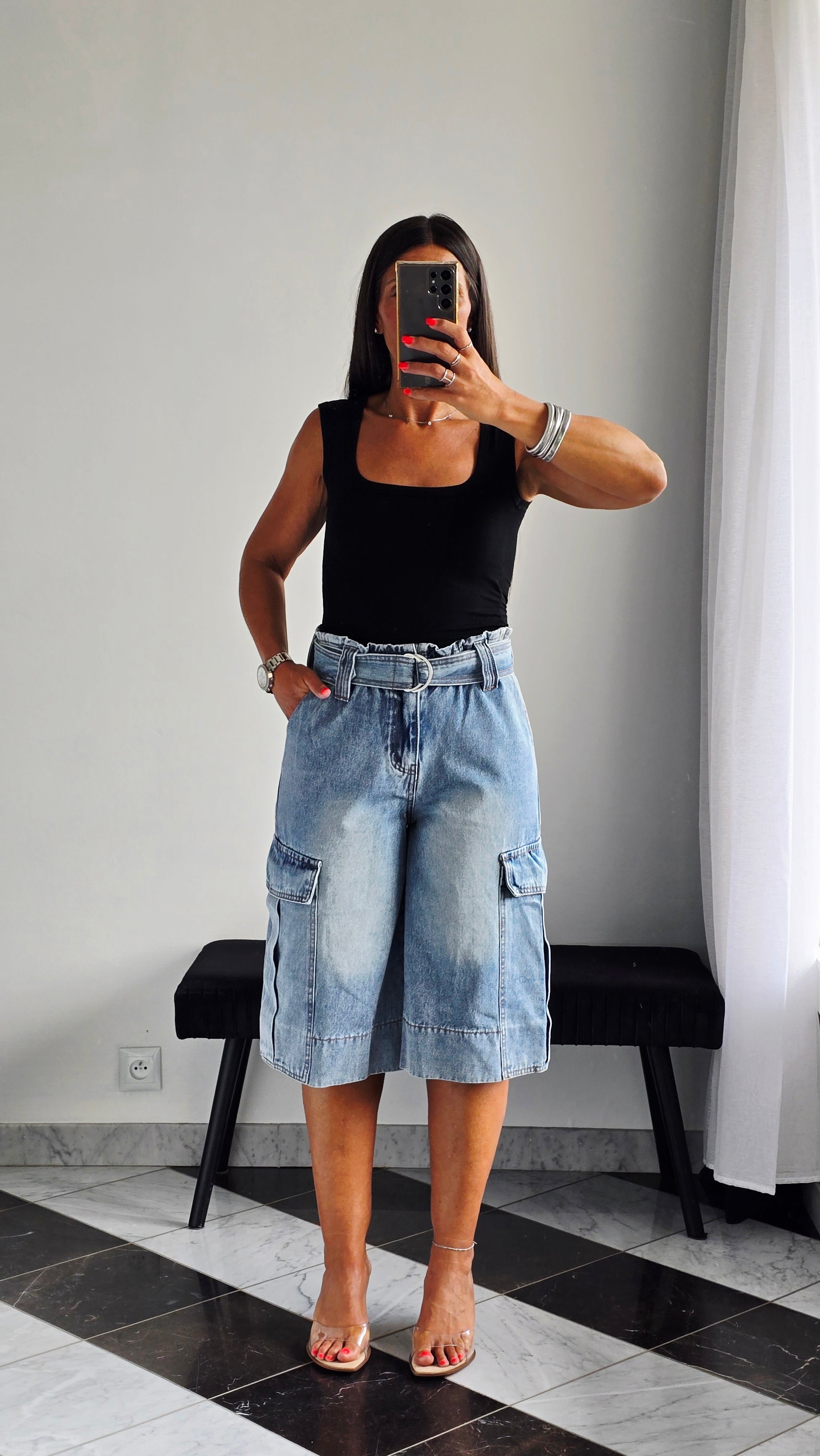 Pièce forte et ultra stylée, ce bermuda en jean revisite la coupe cargo avec une taille paperbag et une ceinture intégrée qui structure parfaitement la silhouette. On aime ses grandes poches à rabat sur les côtés et son look casual-chic, idéal à porter avec un débardeur ou une chemise pour un look urbain assumé.