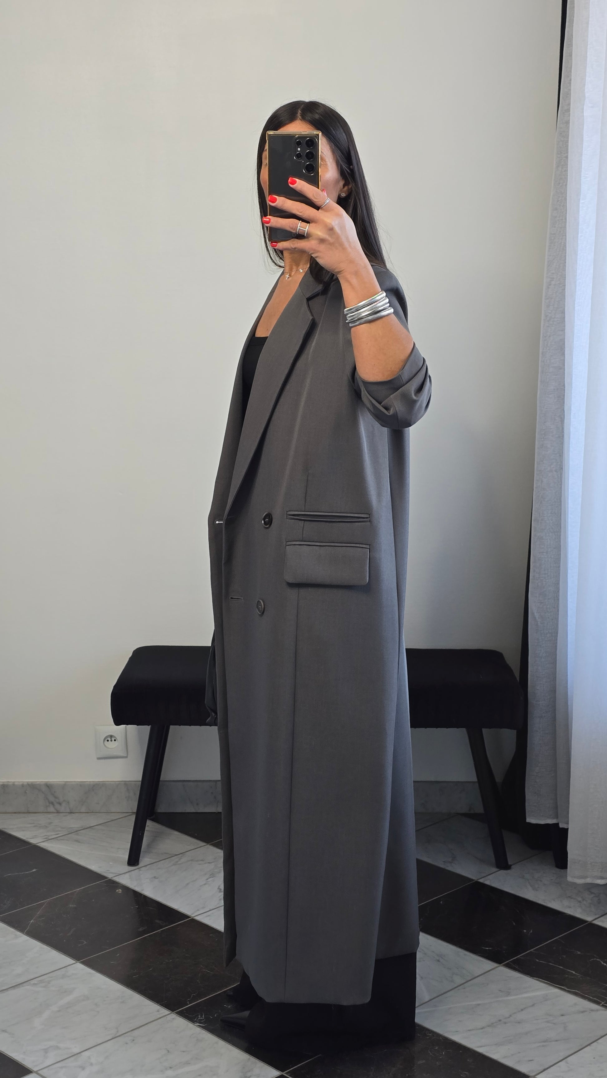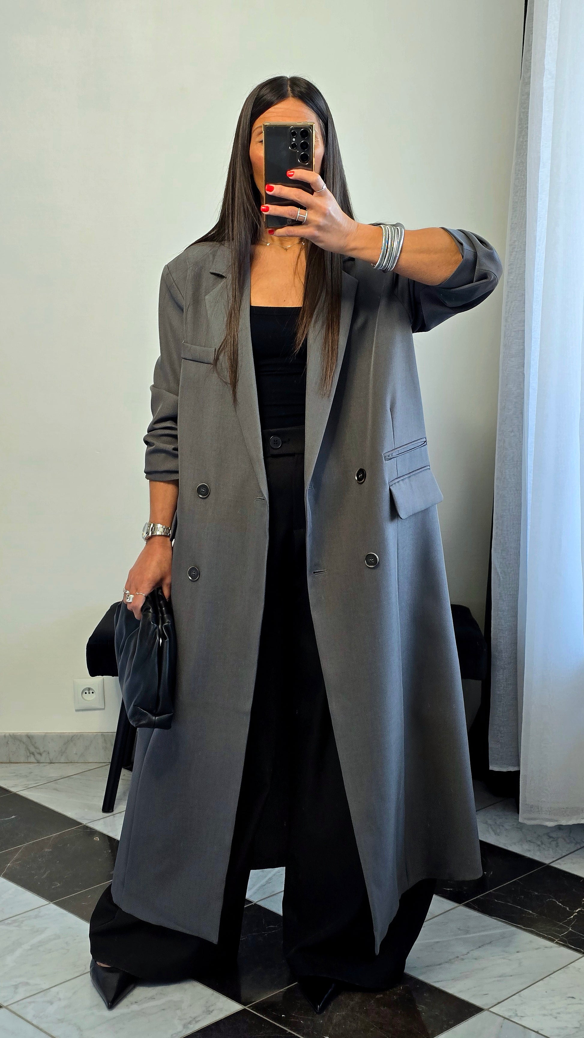 Ce blazer long oversize gris incarne parfaitement l’ADN SOÉLA : une silhouette forte, élégante et résolument moderne.