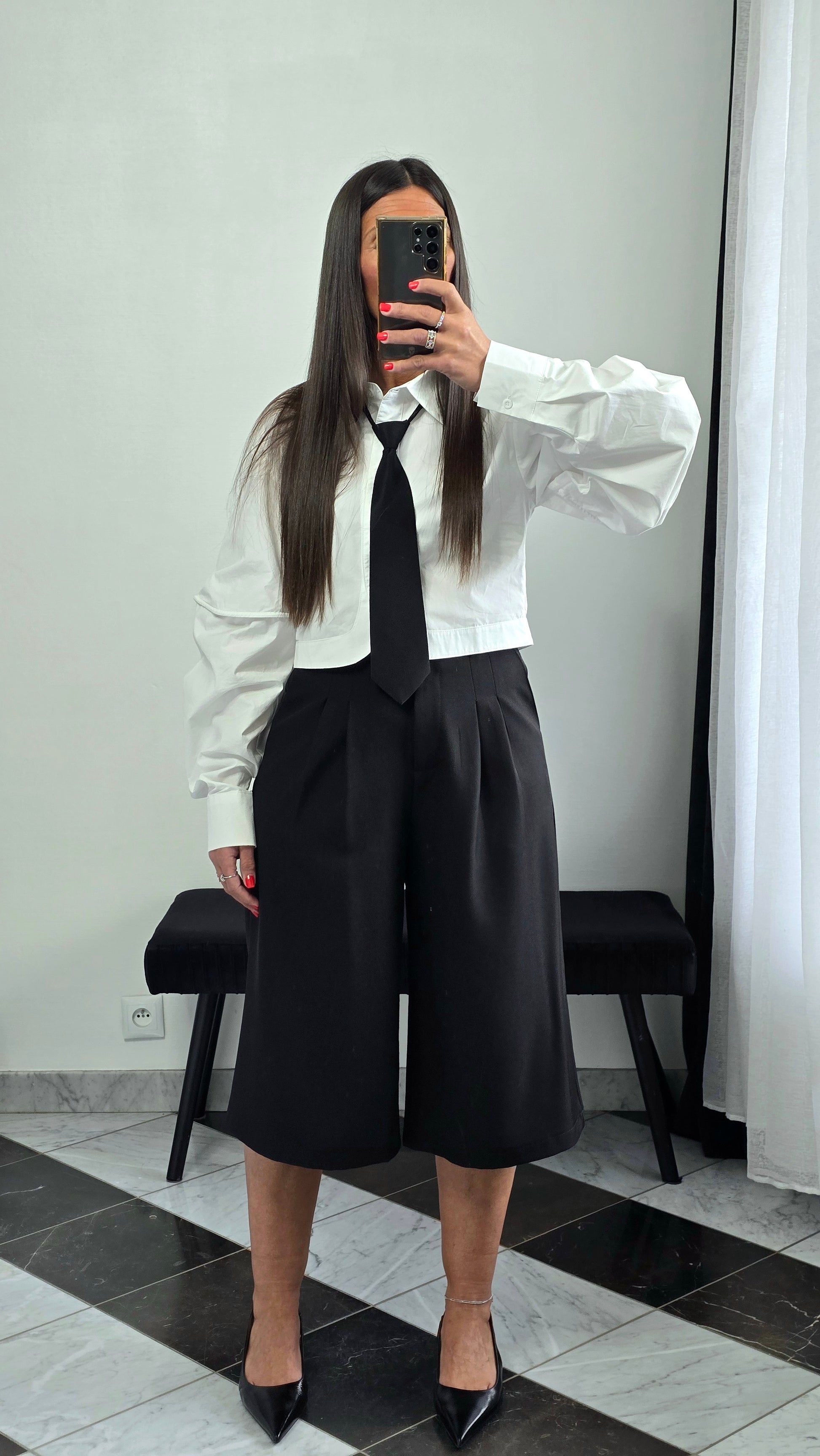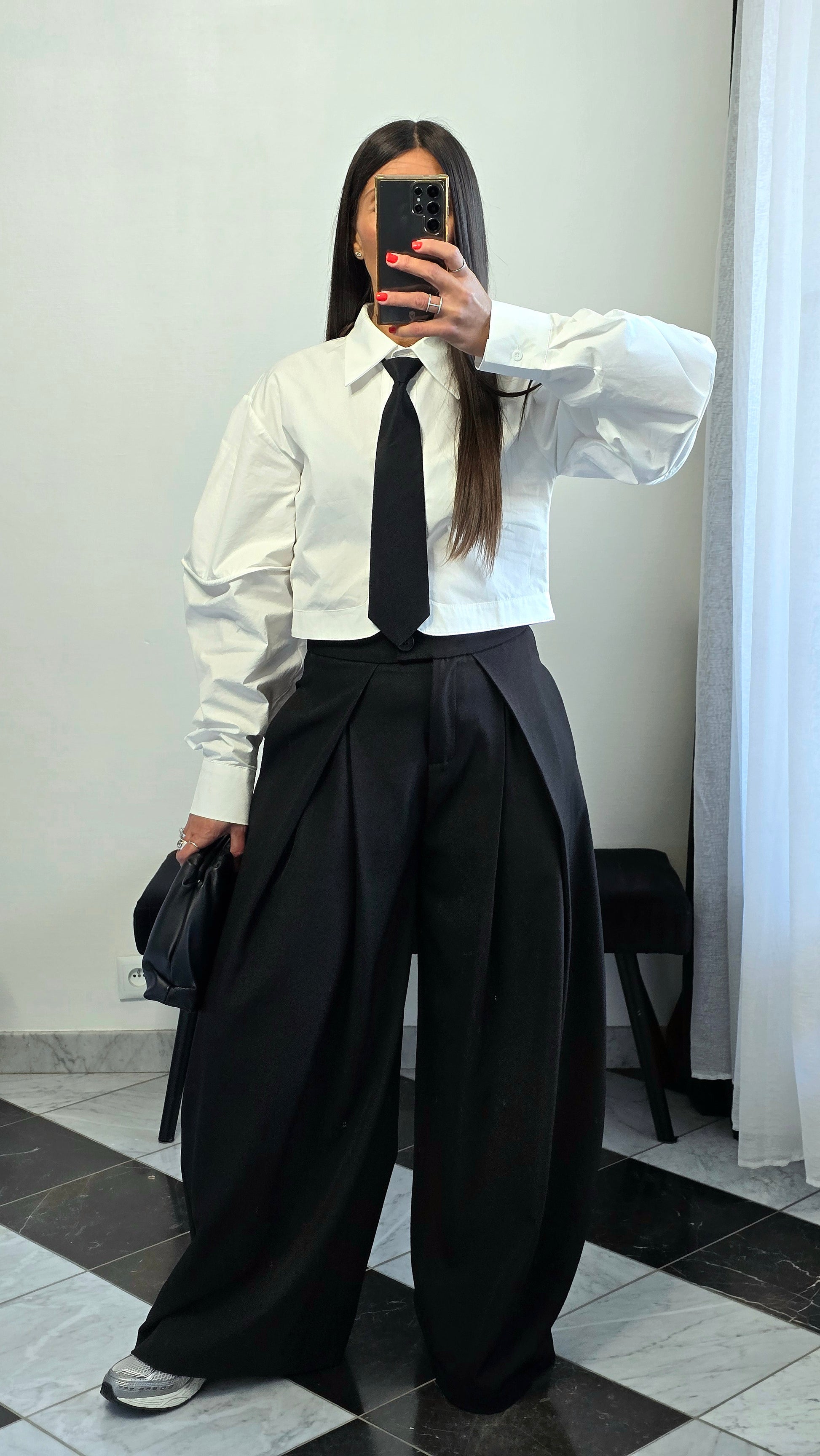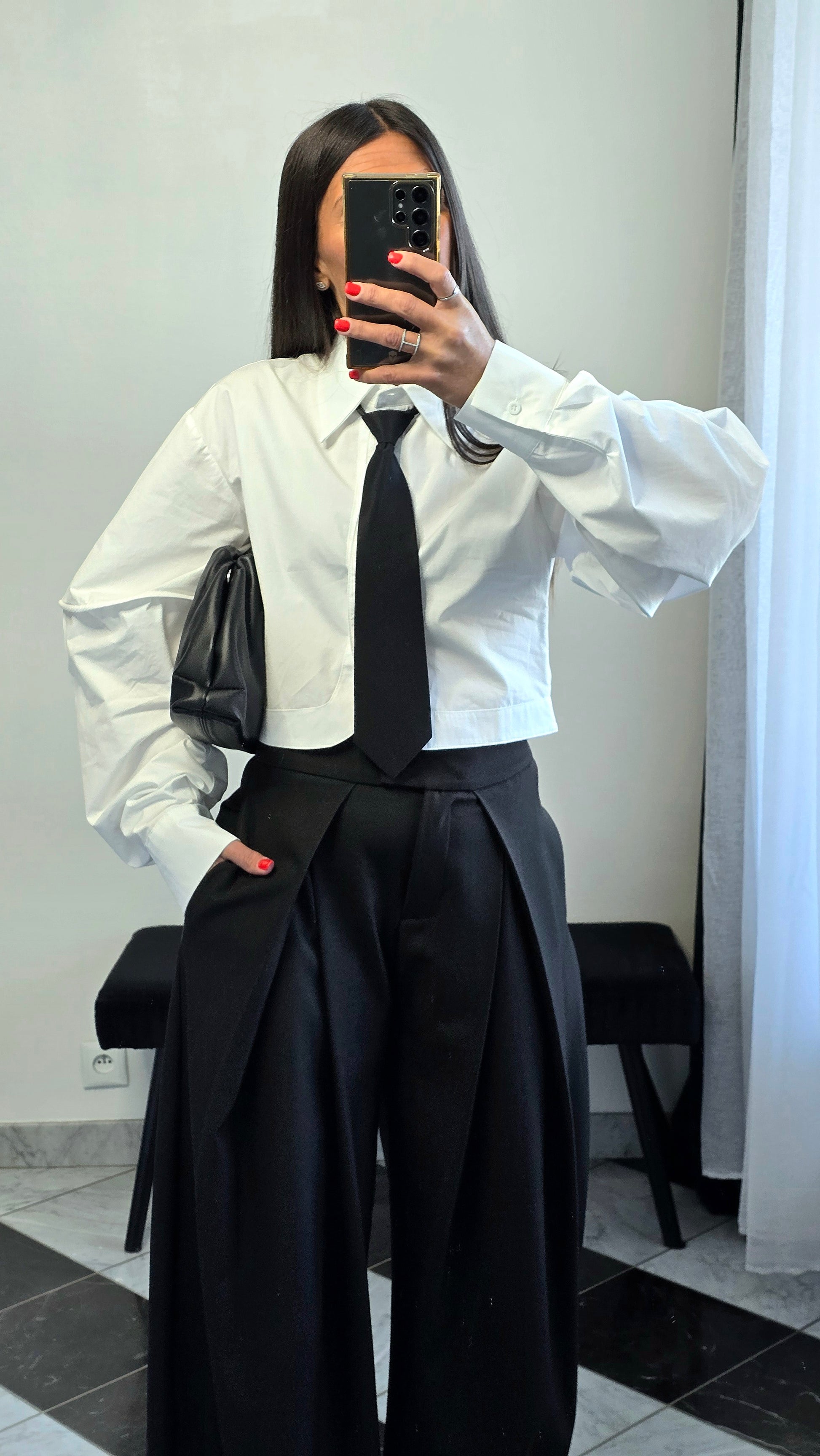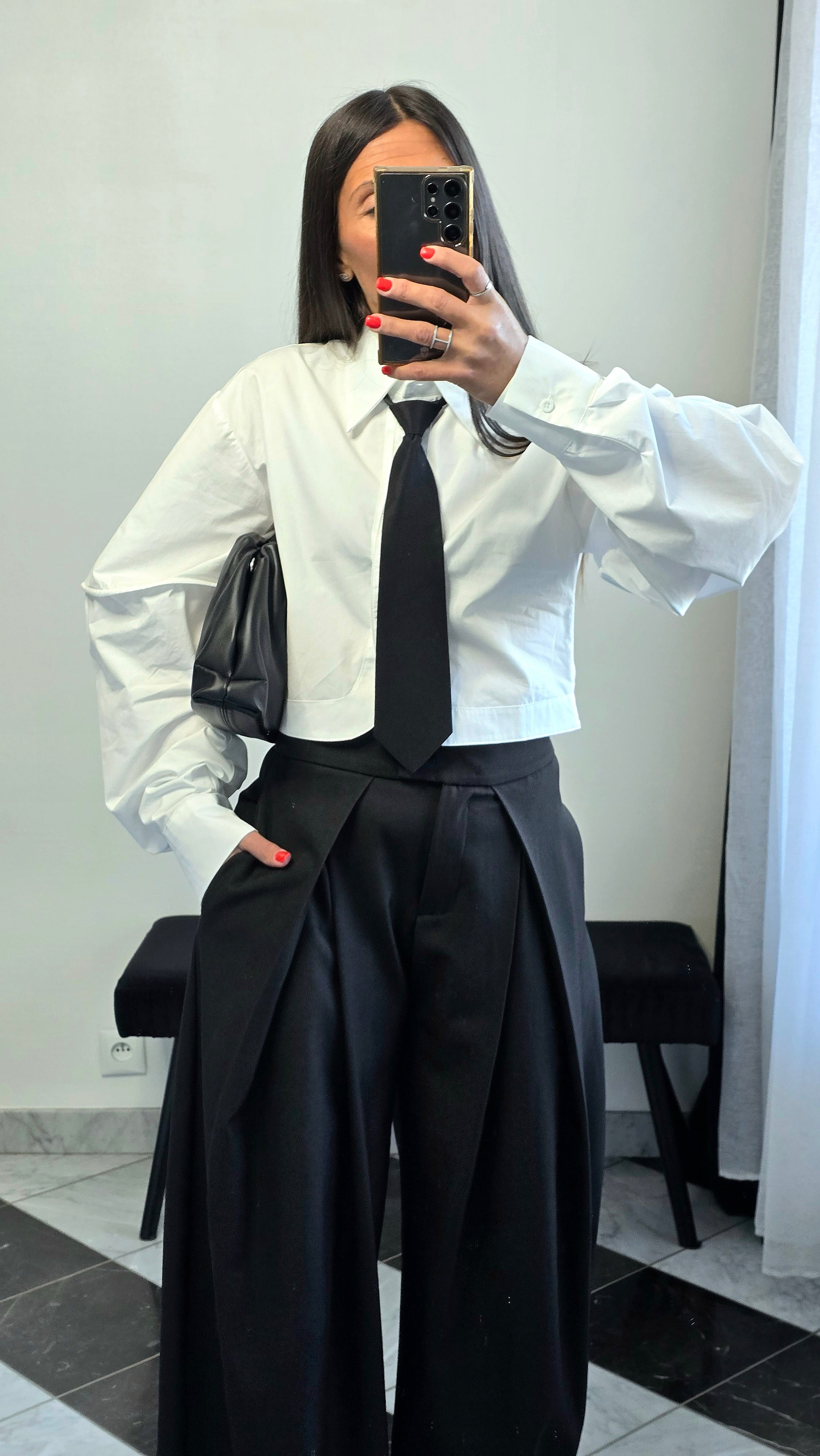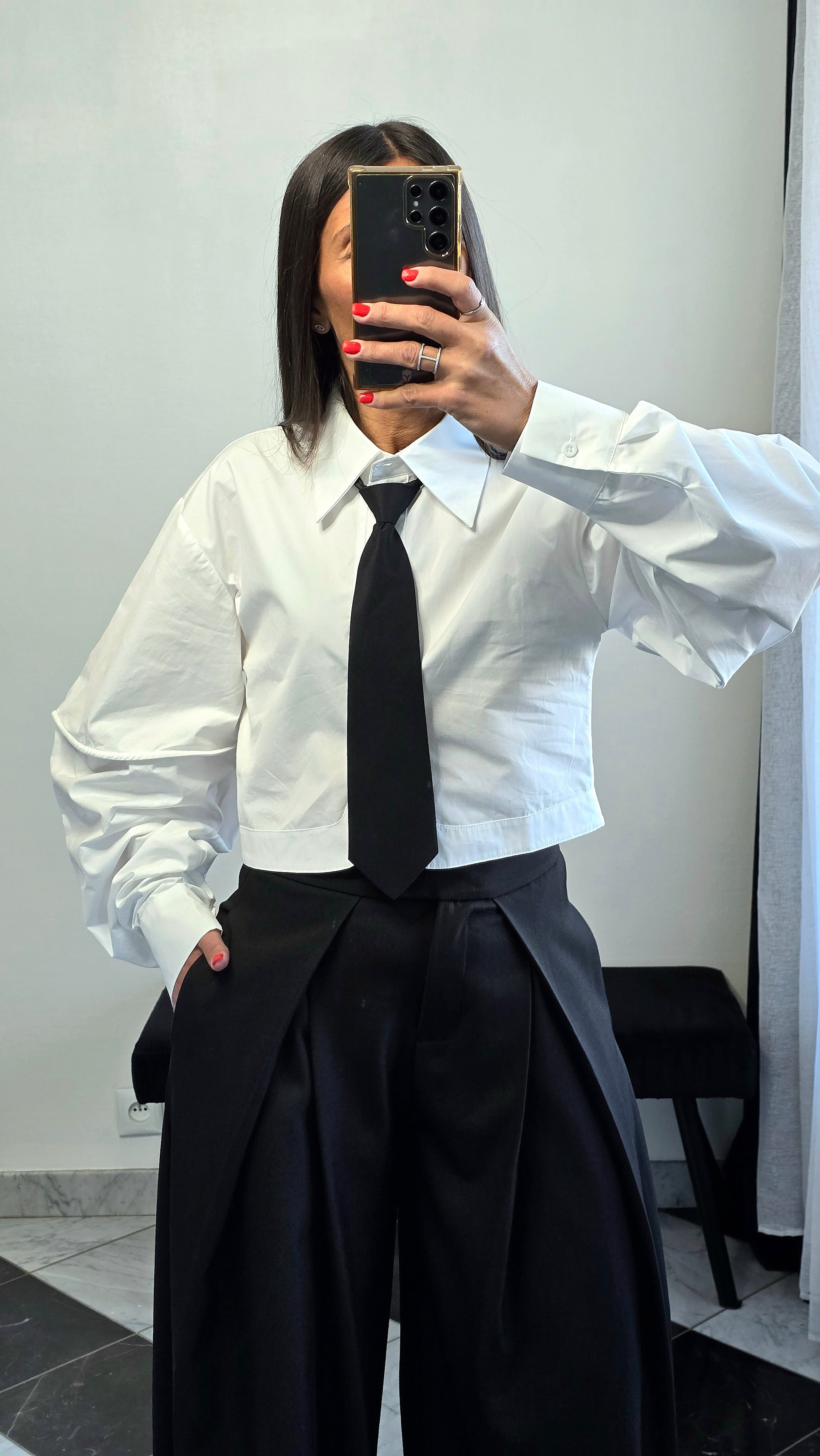 Cette chemise crop blanche avec cravate intégrée revisite l’univers du tailoring avec modernité et caractère.