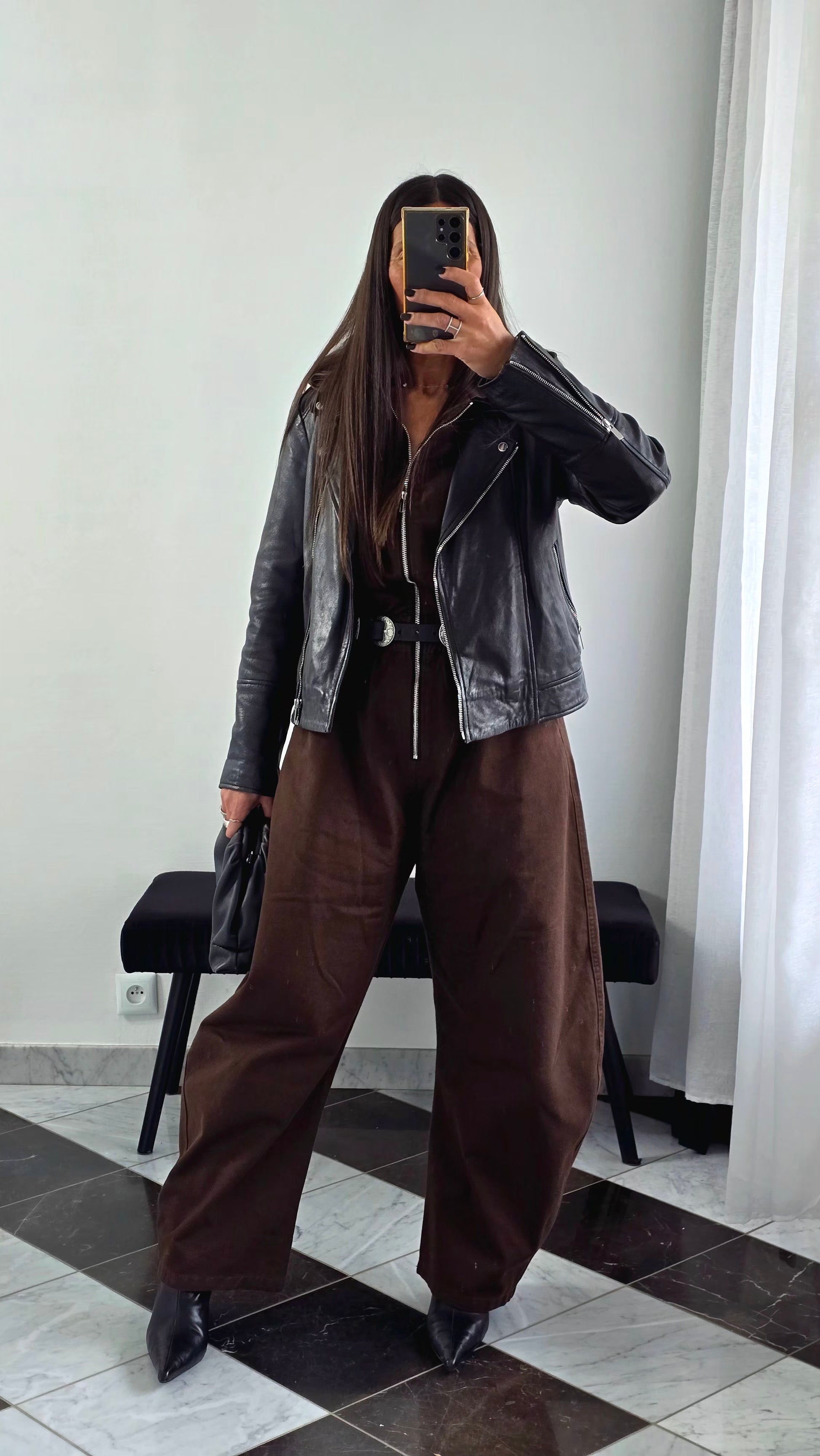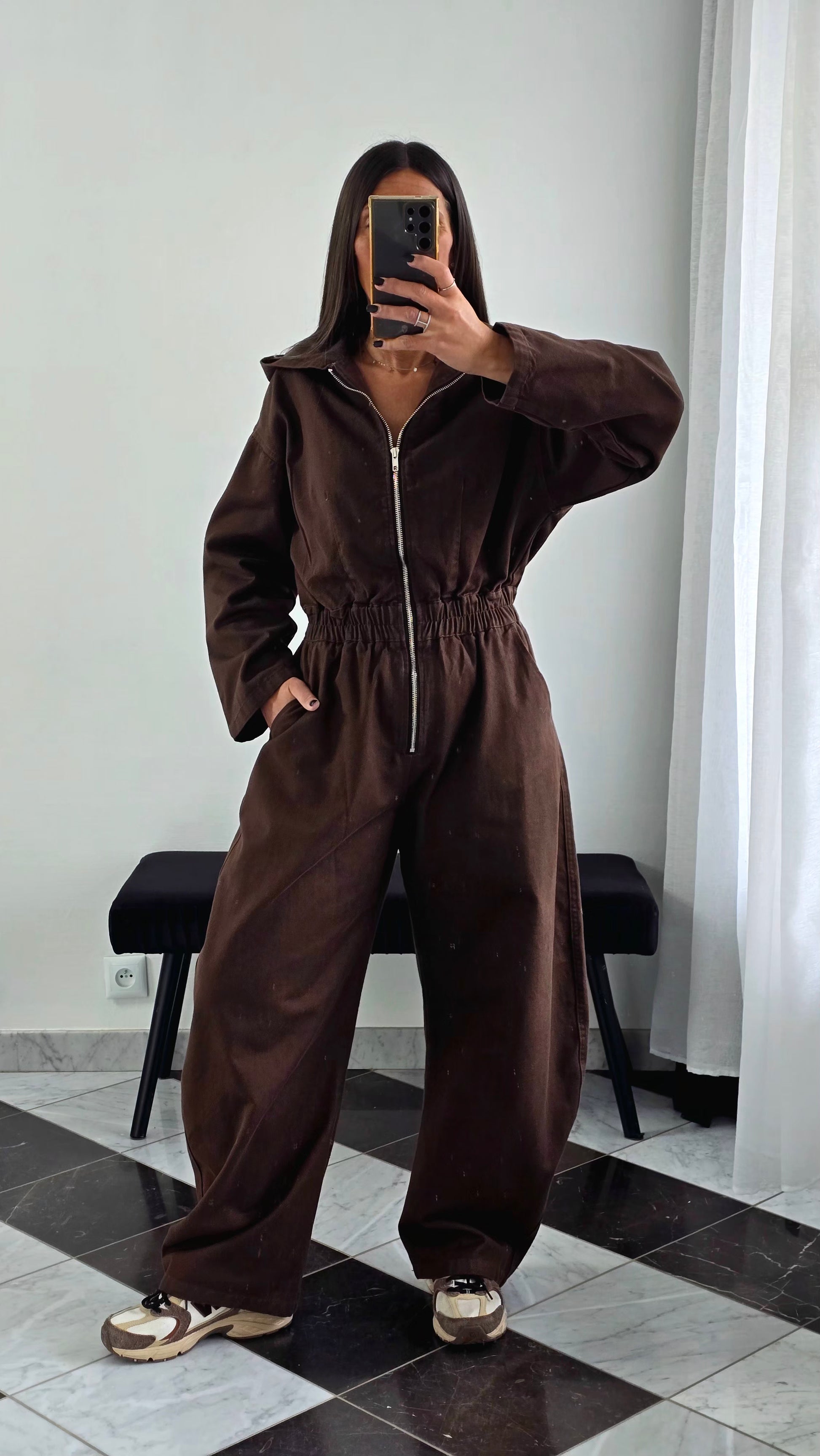 Après le succès de la version en jean, voici la combinaison iconique revisitée dans un magnifique coloris chocolat, ultra chic, ultra tendance et surtout incroyablement confortable.