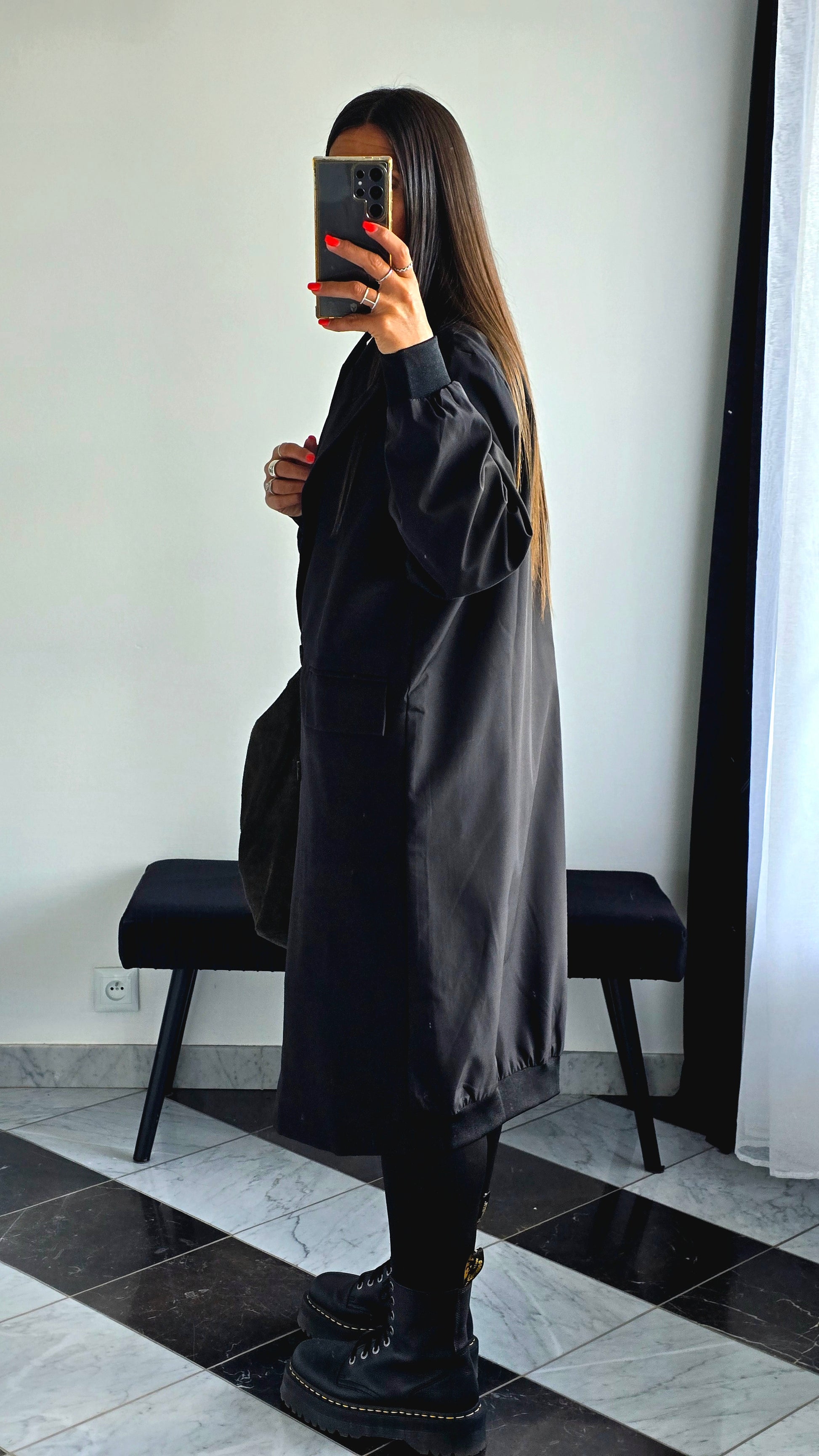 Un manteau signature et ultra-tendance, qui mélange l’élégance d’un blazer long et la modernité du bombers. Une coupe oversize maîtrisée, sublimée par un travail de détails exceptionnel :