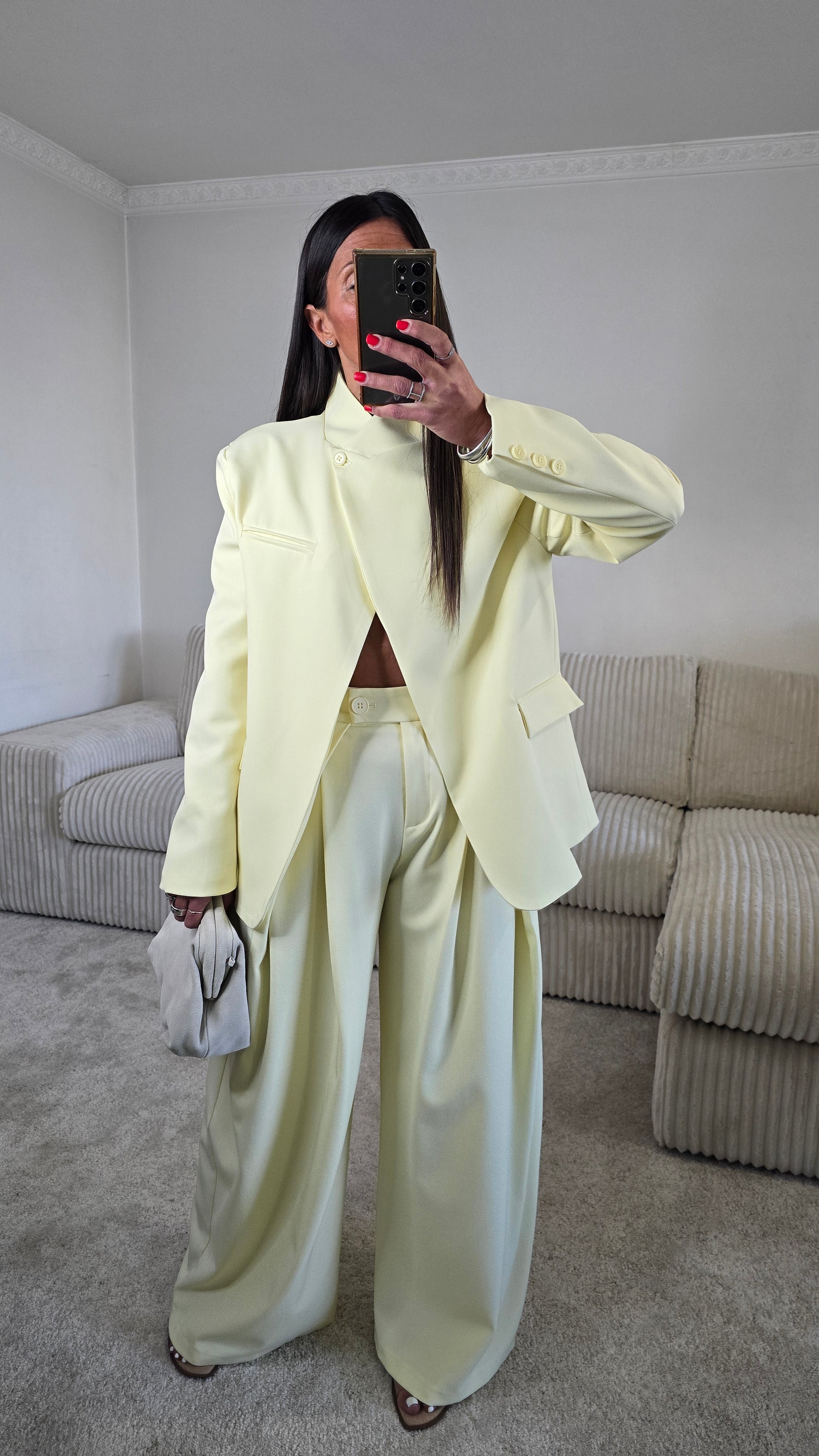Une pièce forte et lumineuse qui structure la silhouette et attire le regard : le pantalon tailoring jaune beurre, parfait pour créer des looks modernes, élégants et inoubliables.