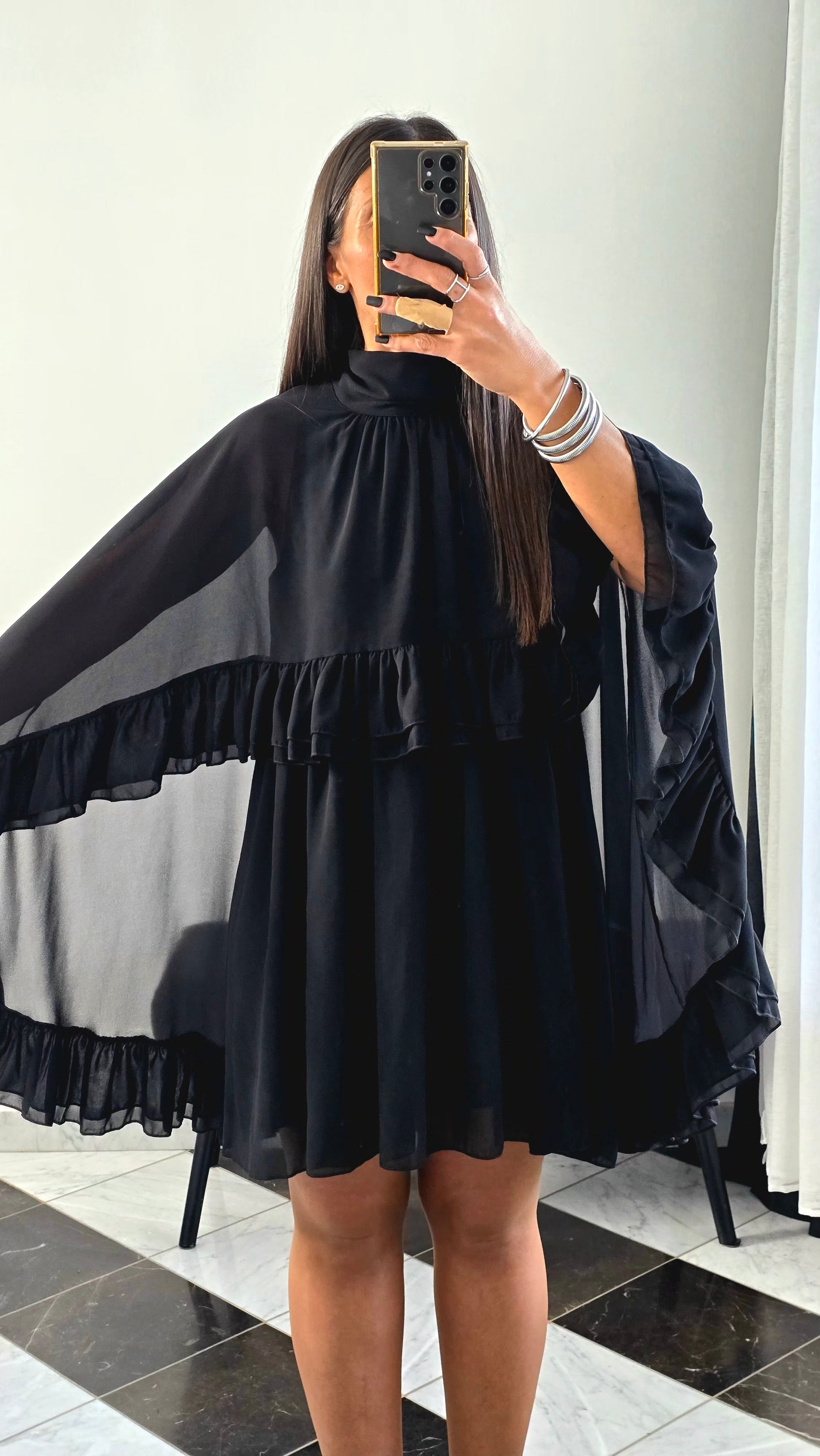 La Robe Cape Volants est une robe courte au volume fluide, sublimée par une cape légère et transparente ornée de volants.