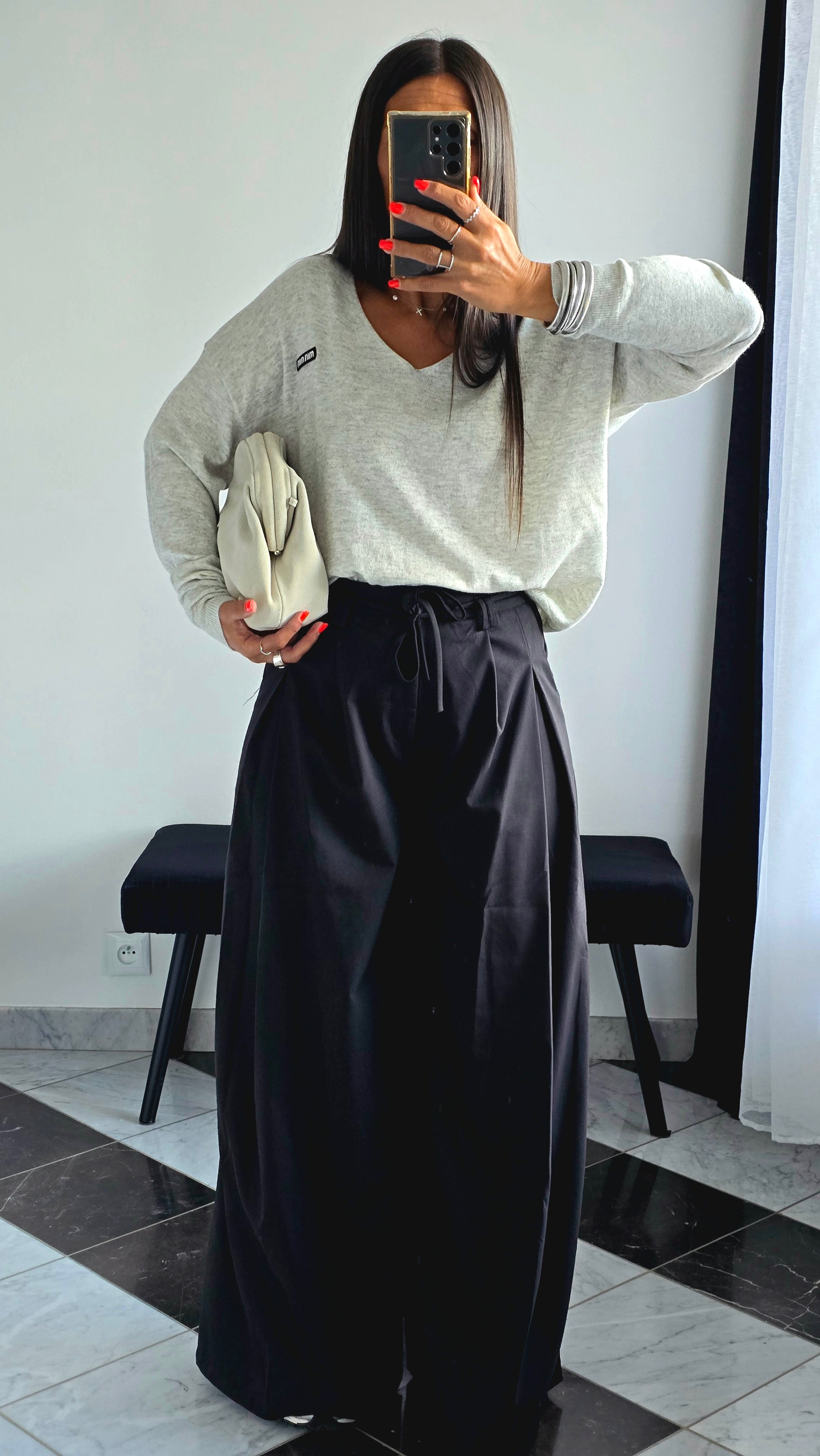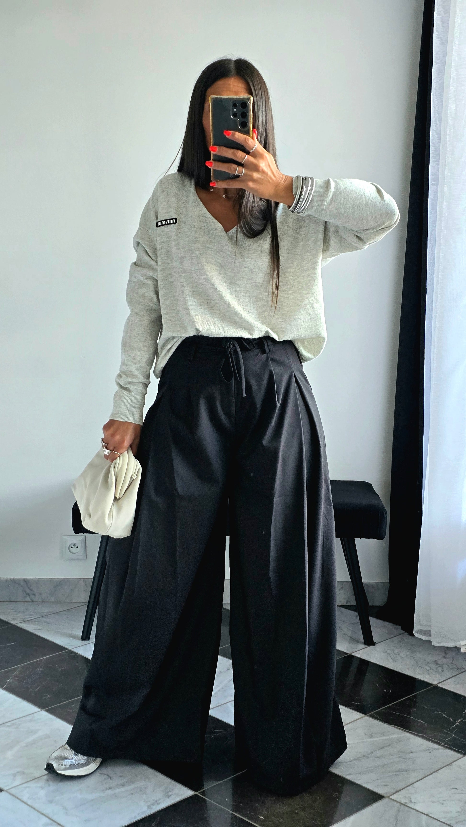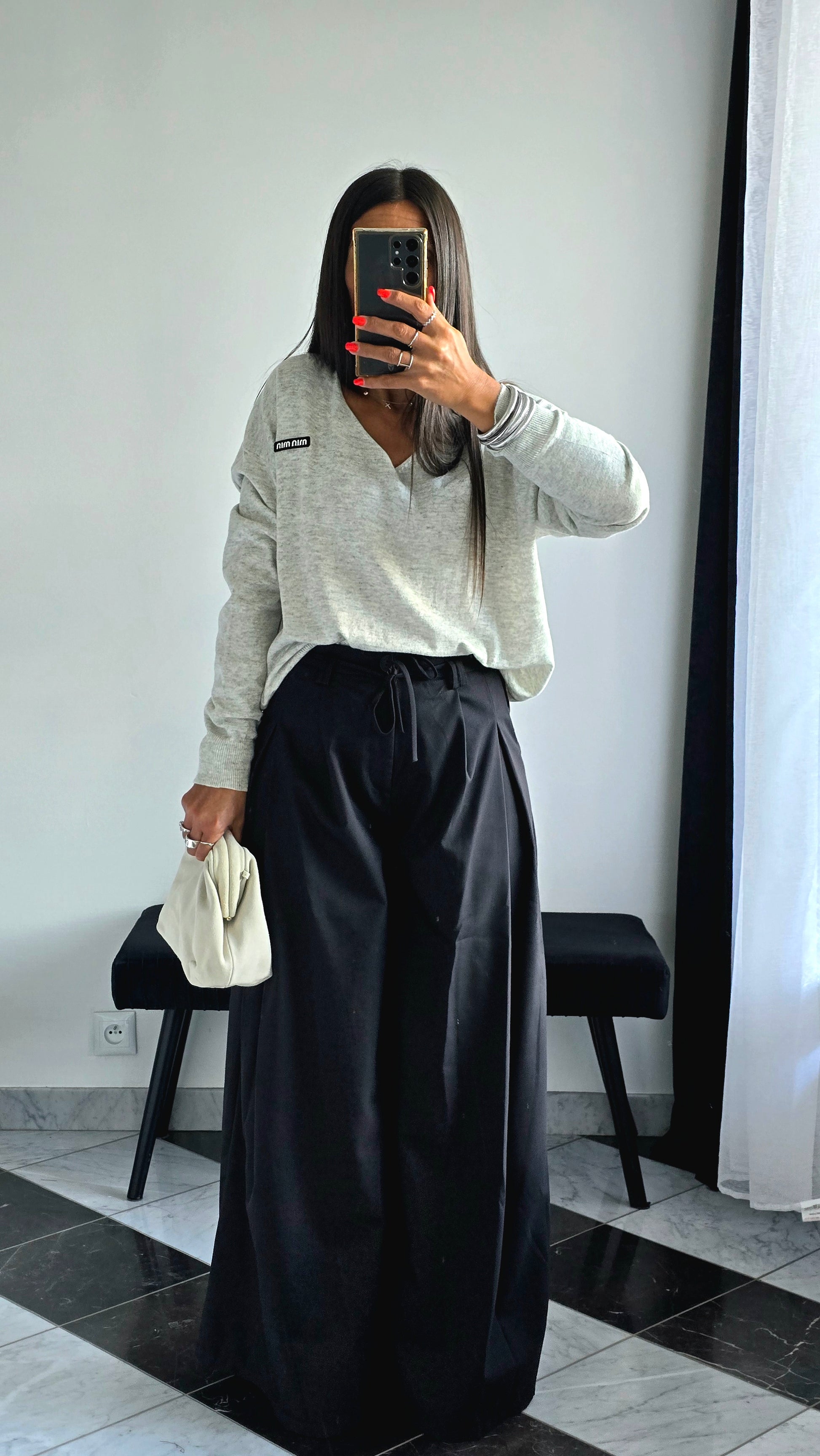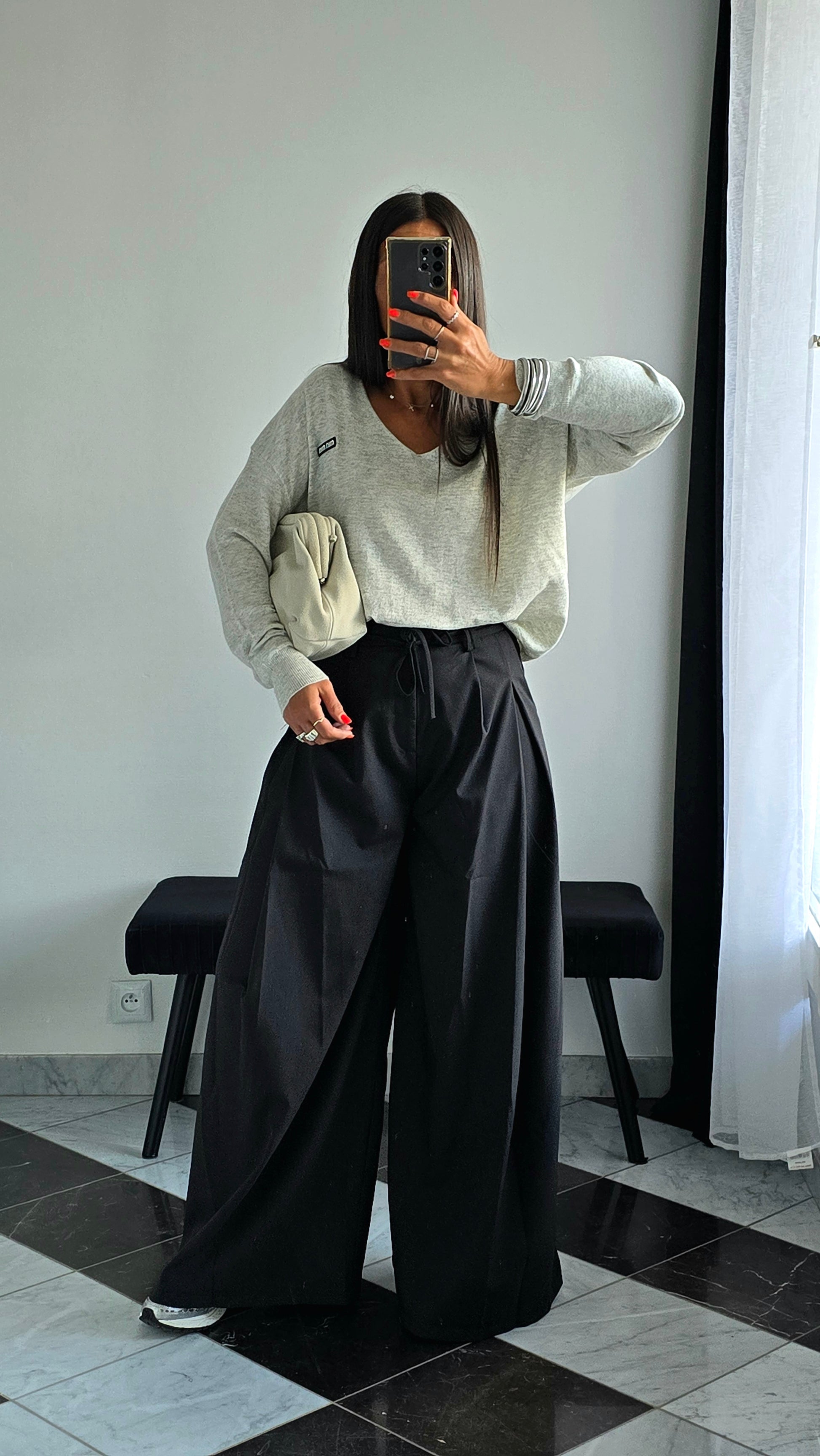 Avec un pantalon palazzo noir et un pull loose clair, pour un look minimaliste et élégant