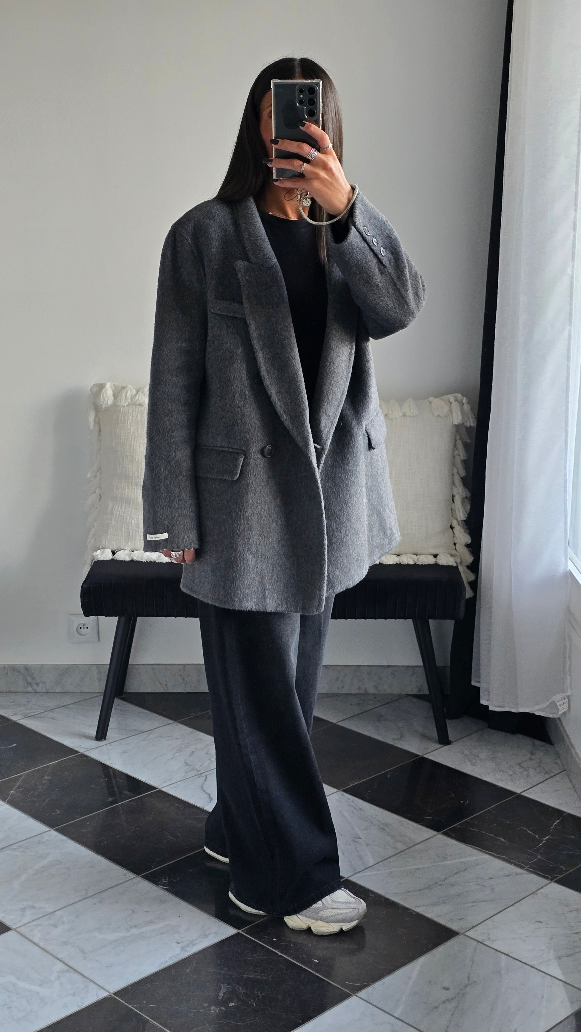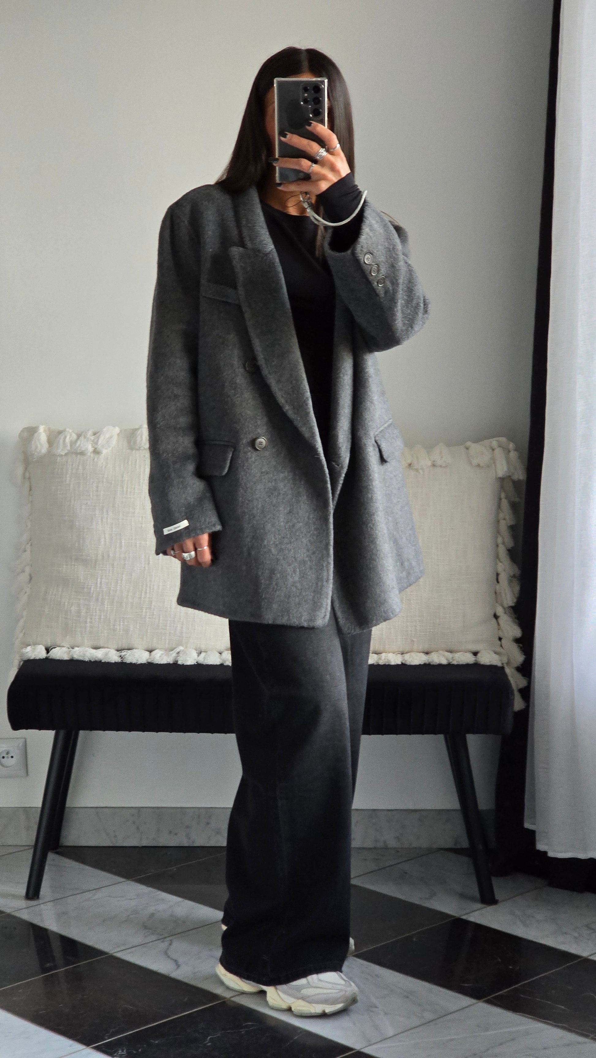 Optez pour l'élégance artisanale avec cette veste blazer en laine fait main. Sa coupe oversize et son coloris gris foncé intemporel en font un must-have pour vos tenues d’hiver. Alliant confort, chaleur et style, cette veste est idéale pour sublimer vos looks casual ou habillés.