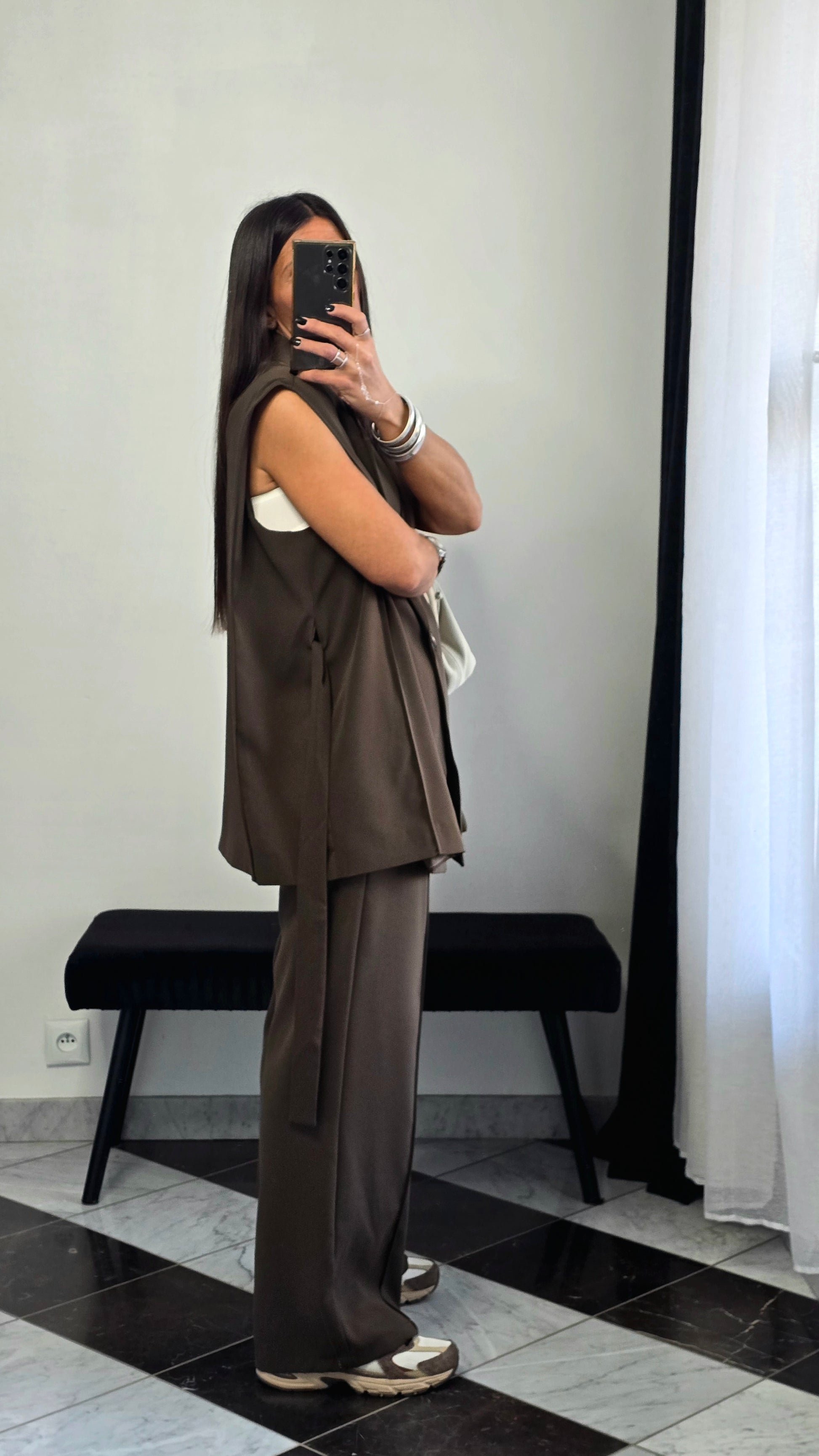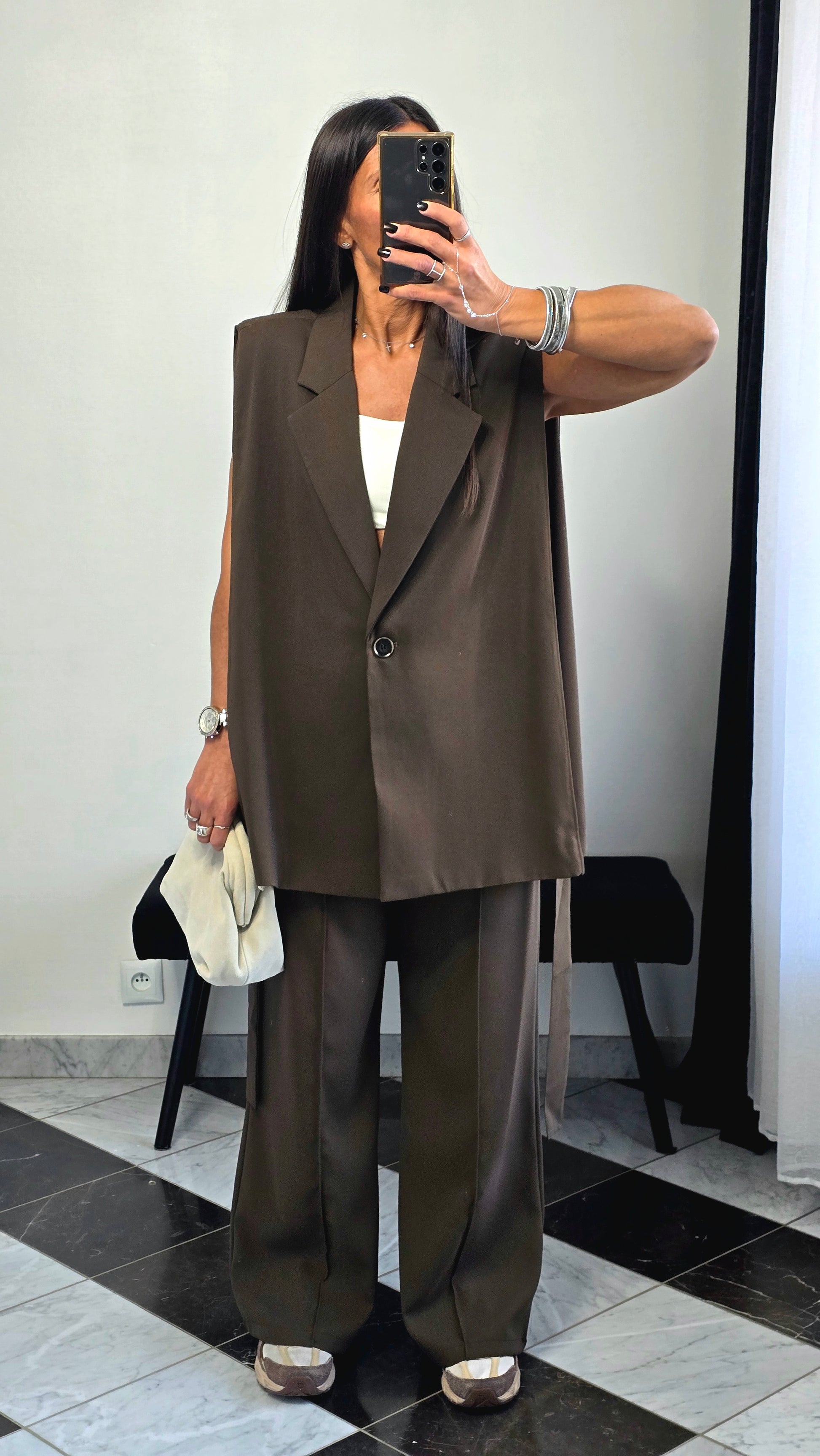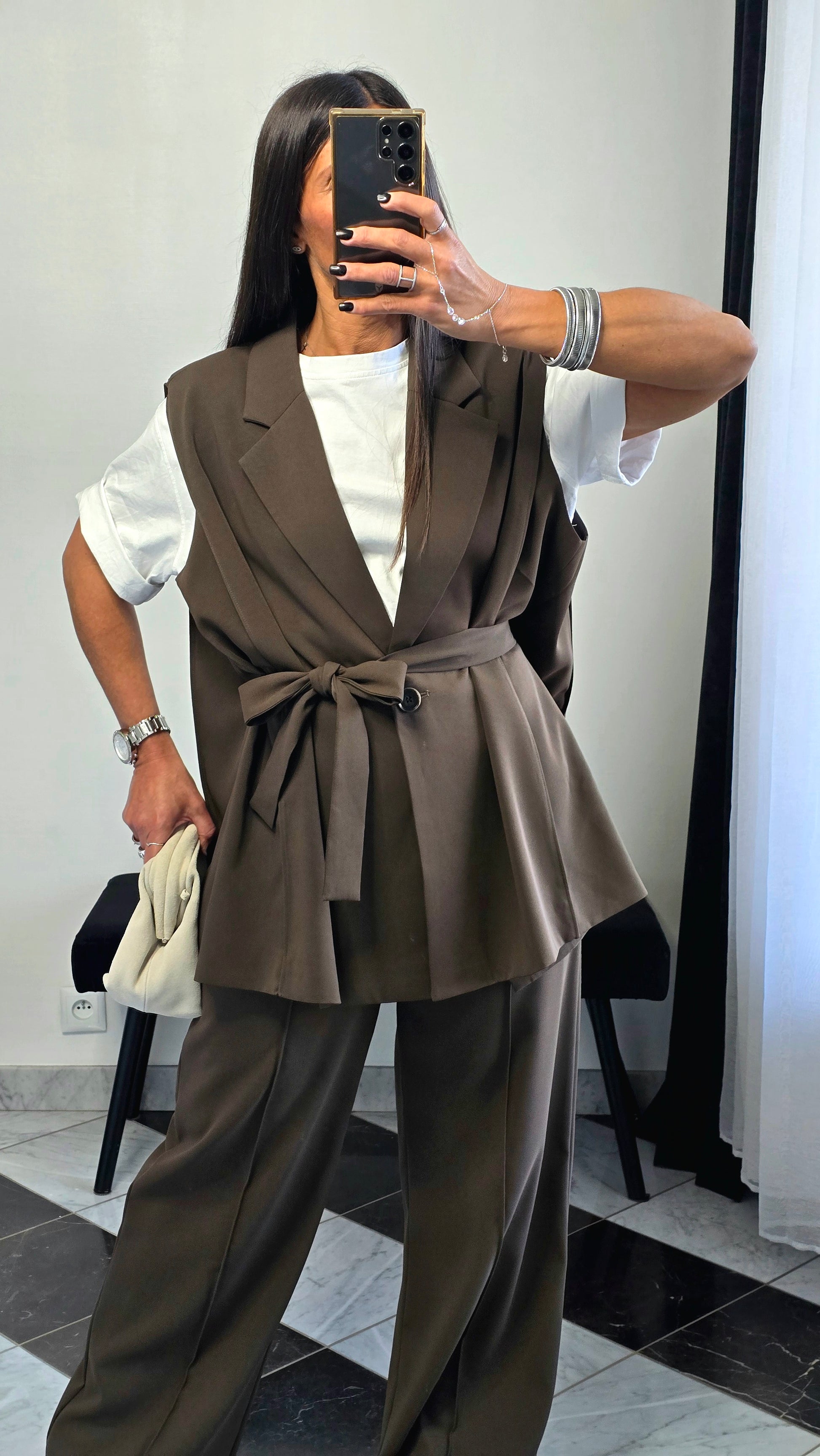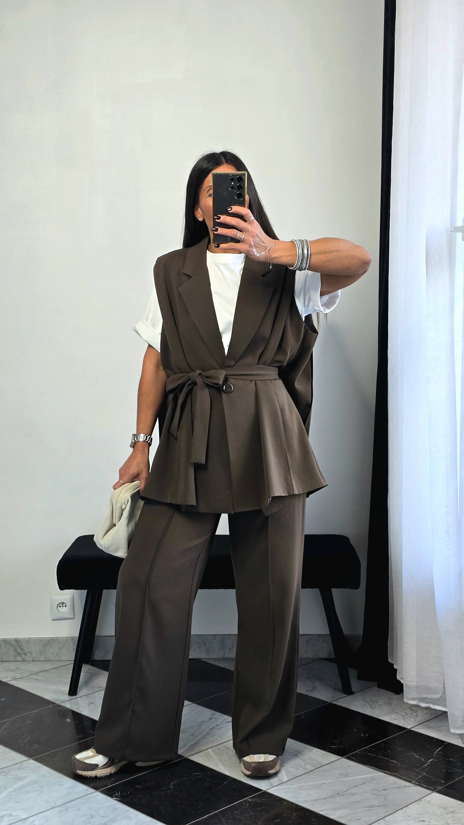 Veste sans manches marron – coupe tailoring & détail ceinture