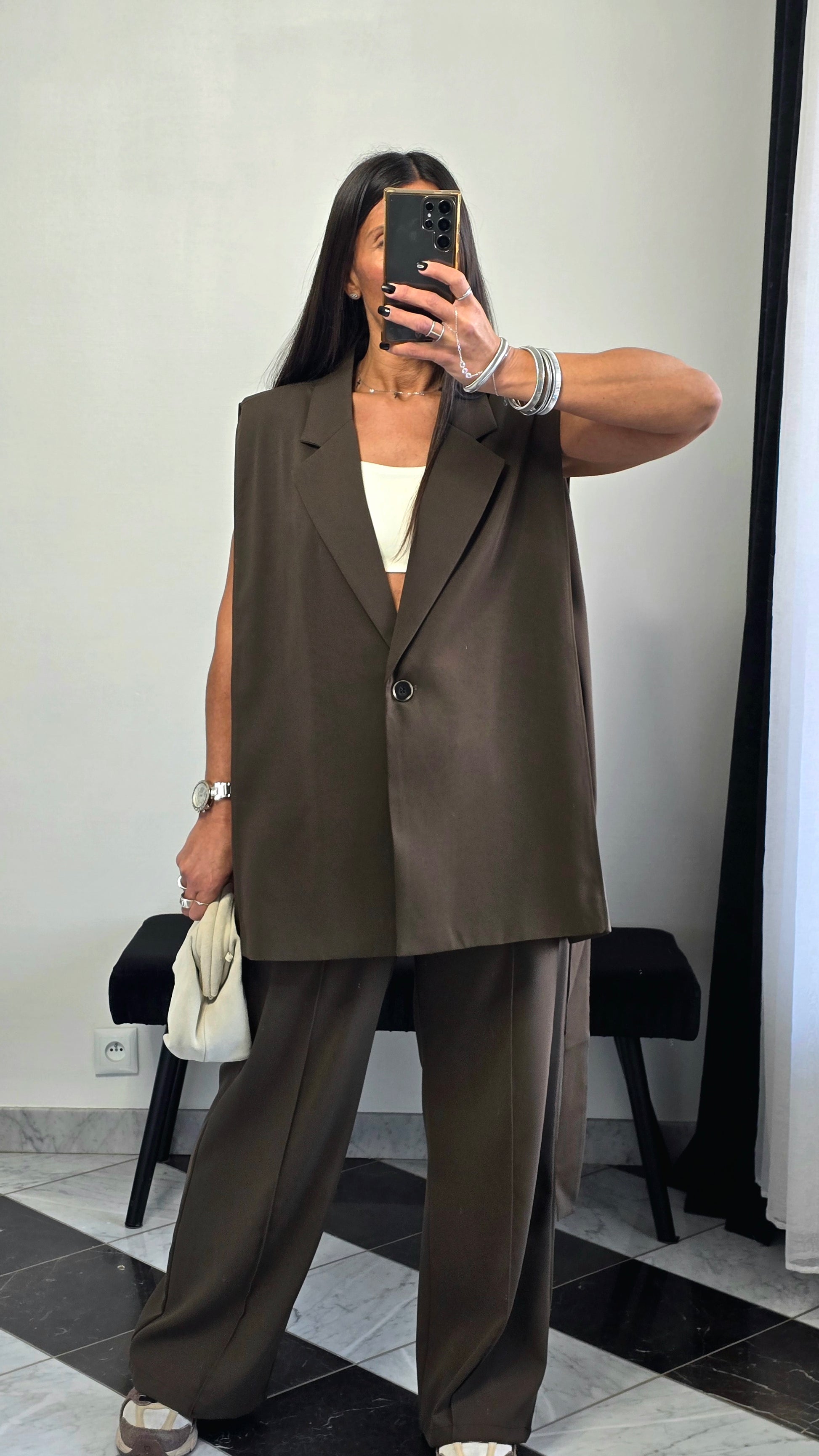 La veste sans manches marron est la pièce signature qui transforme instantanément une silhouette.